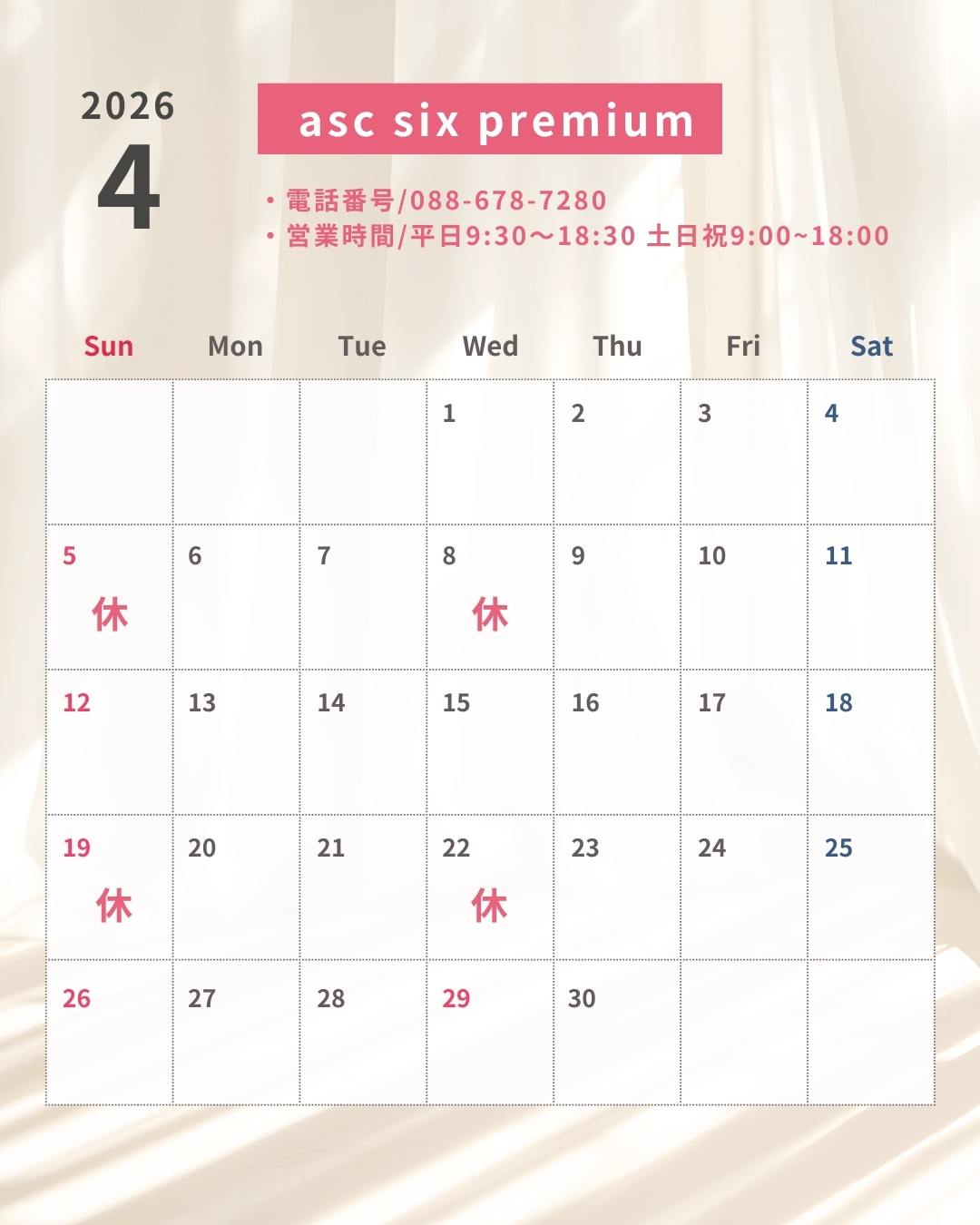 | asc six premium | 年末年始12/31〜1/2は休業させていただきます。 営業時間は営業カレンダーの通りです。 |