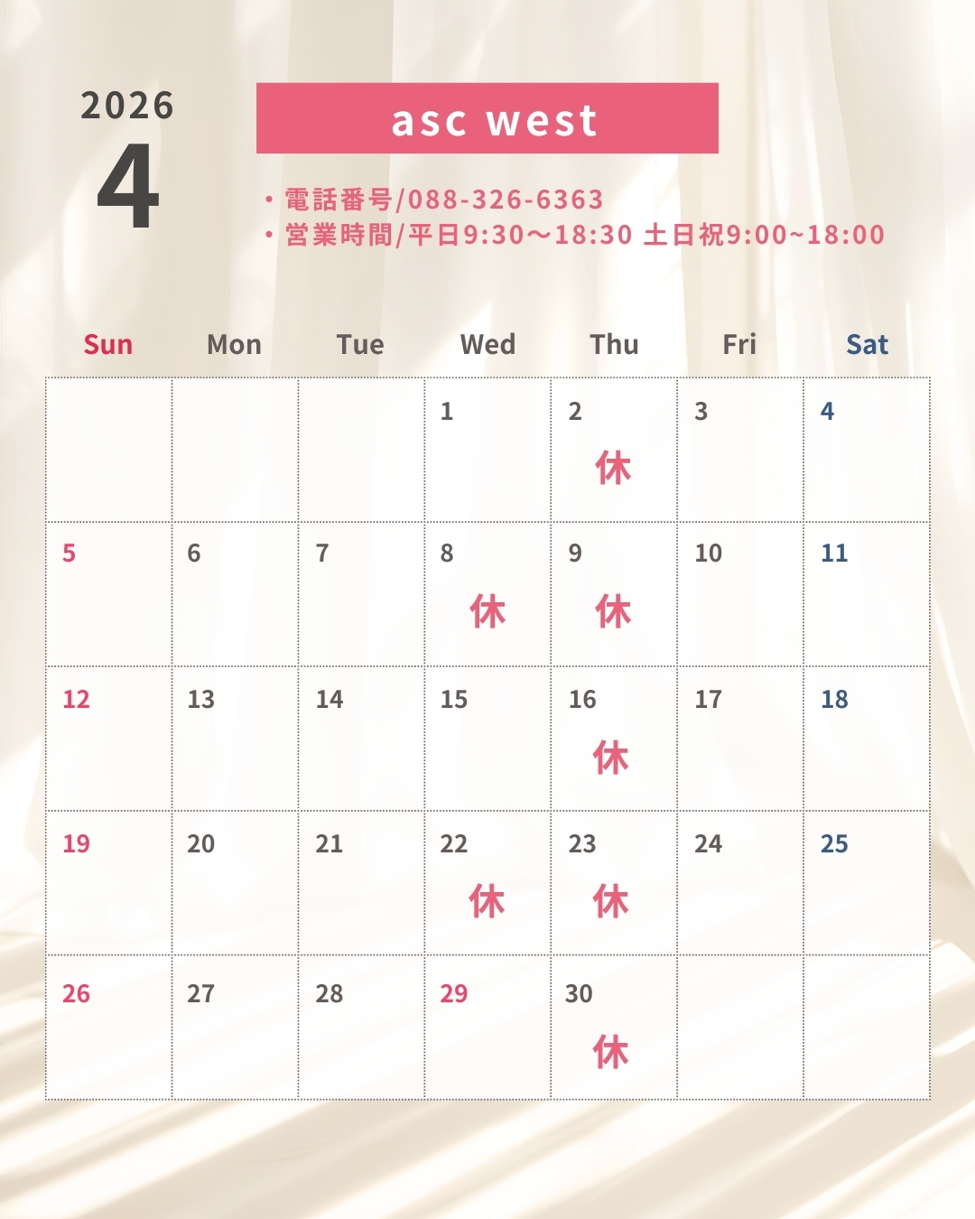 | asc west | 年末年始12/31〜1/2は休業させていただきます。 営業時間は営業カレンダーの通りです。 |