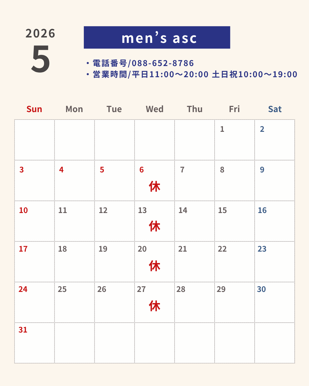 | men’s asc | 年末年始12/31〜1/2は休業させていただきます。 営業時間は営業カレンダーの通りです。 |