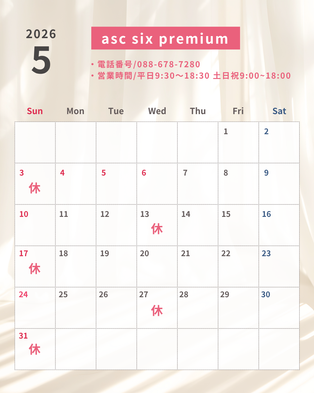 | asc six premium | 年末年始12/31〜1/2は休業させていただきます。 営業時間は営業カレンダーの通りです。 |