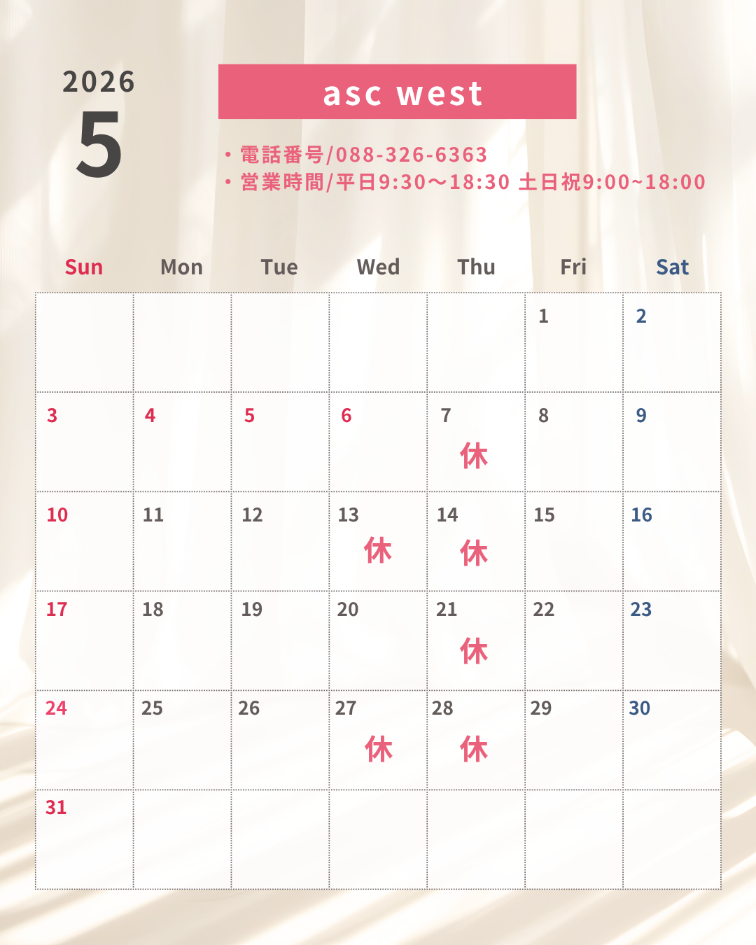 | asc west | 年末年始12/31〜1/2は休業させていただきます。 営業時間は営業カレンダーの通りです。 |