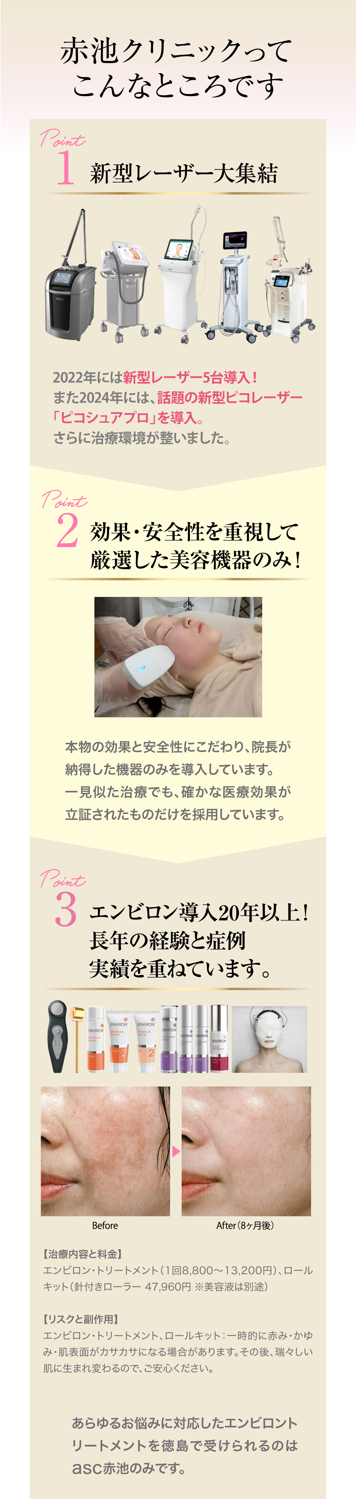 エンビロントリートメント:一時的に赤み・かゆみ・肌表面がカサカサになる場合があります。その後、瑞々しい肌に生まれ変わるので、ご安心ください。