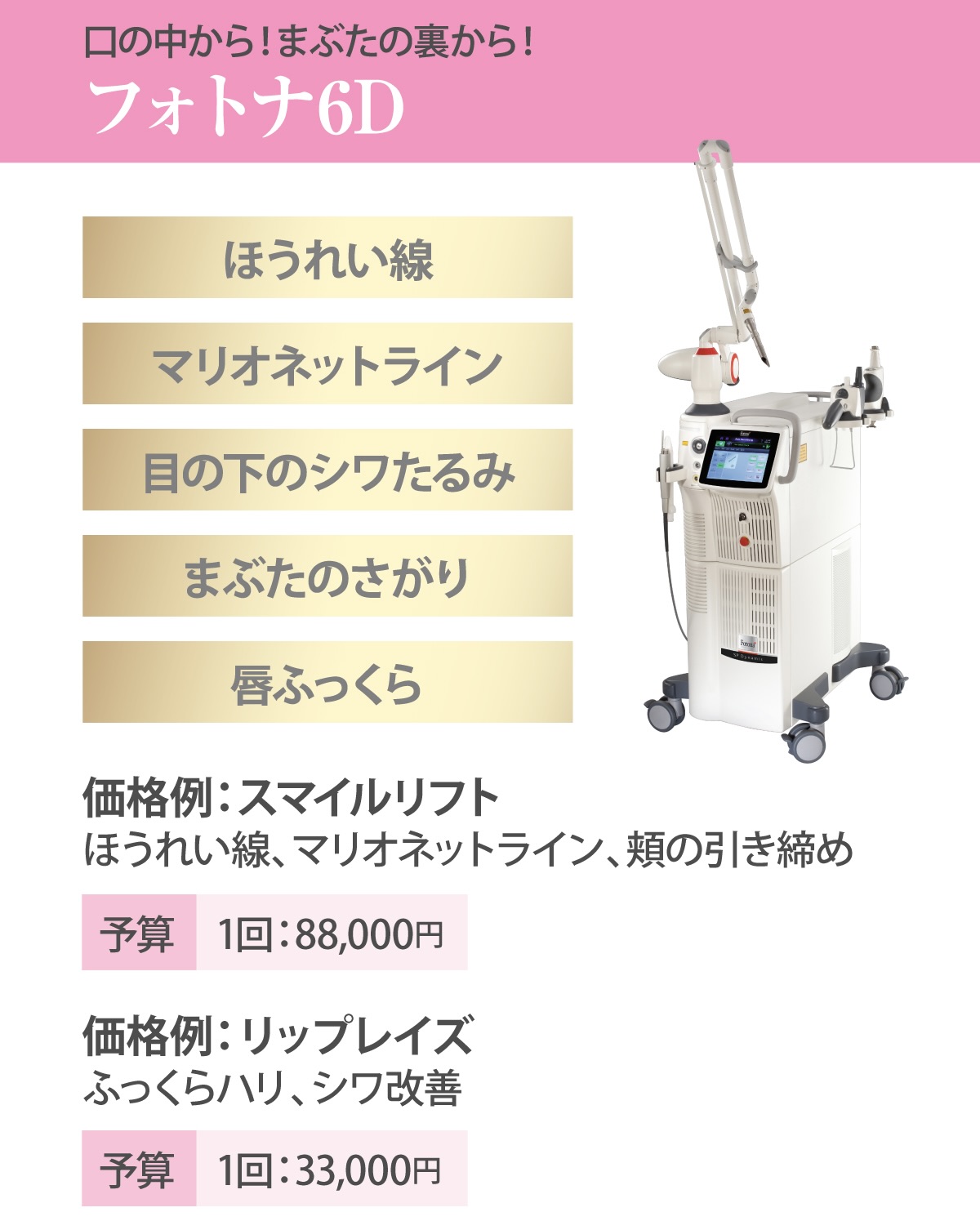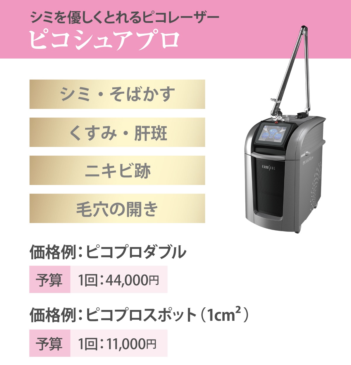 ピコプロトーニング(1回:22,000円)、ピコプロフラクショナル(1回:33,000円)、ピコプロスポット(1cm四方/11,000円)