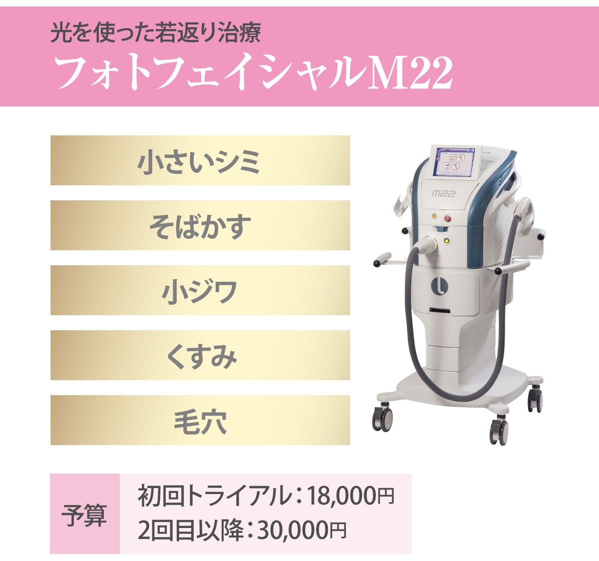フォトフェイシャルM22(初回トライアル:18,000円/2回目以降:30,000円)、ロールキット(針付きローラー47,960円※美容液は別途)