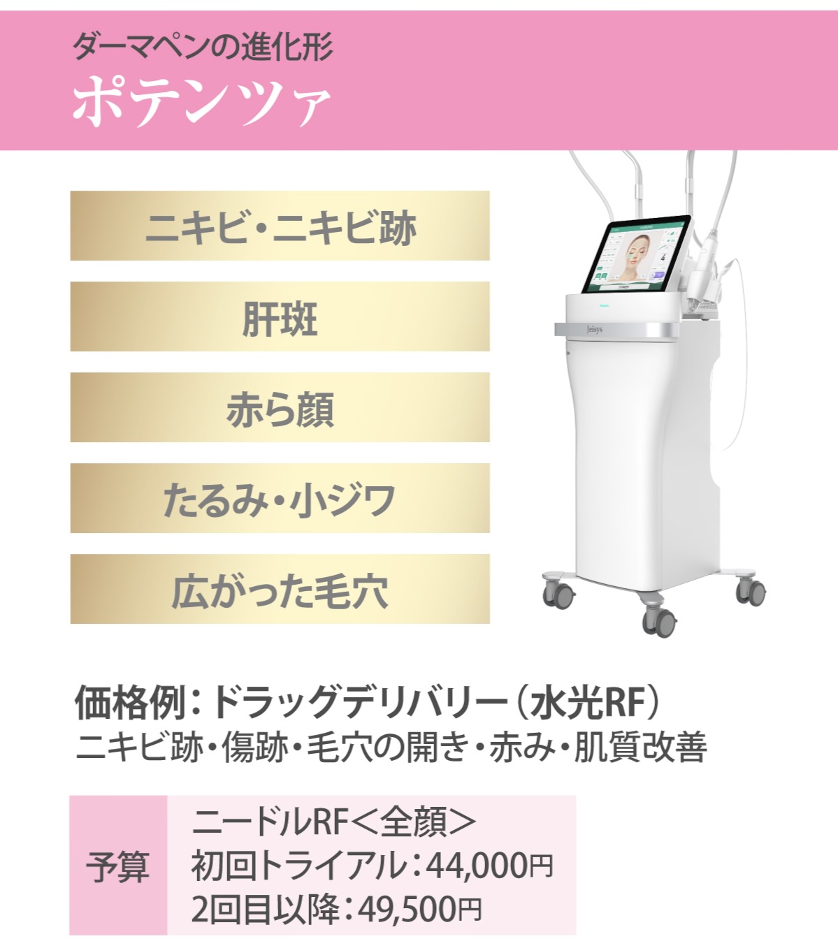 【治療内容と料金】ヴィーナス ヴェルサ VIVA(3回コース231,000円)、ロールキット(針付きローラー47,960円※美容液は別途)、エンビロン・トリートメント(1回 8,800~13,200円)