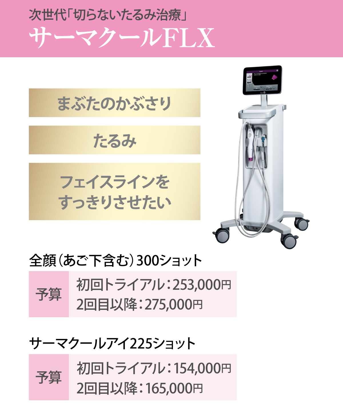 サーマクール:全顔(初回トライアル:253,000円/2回目以降:275,000円)、エンビロン・トリートメント(1回 8,800円~13,200円)、ロールキット(針付きローラー47,960円※美容液は別途)