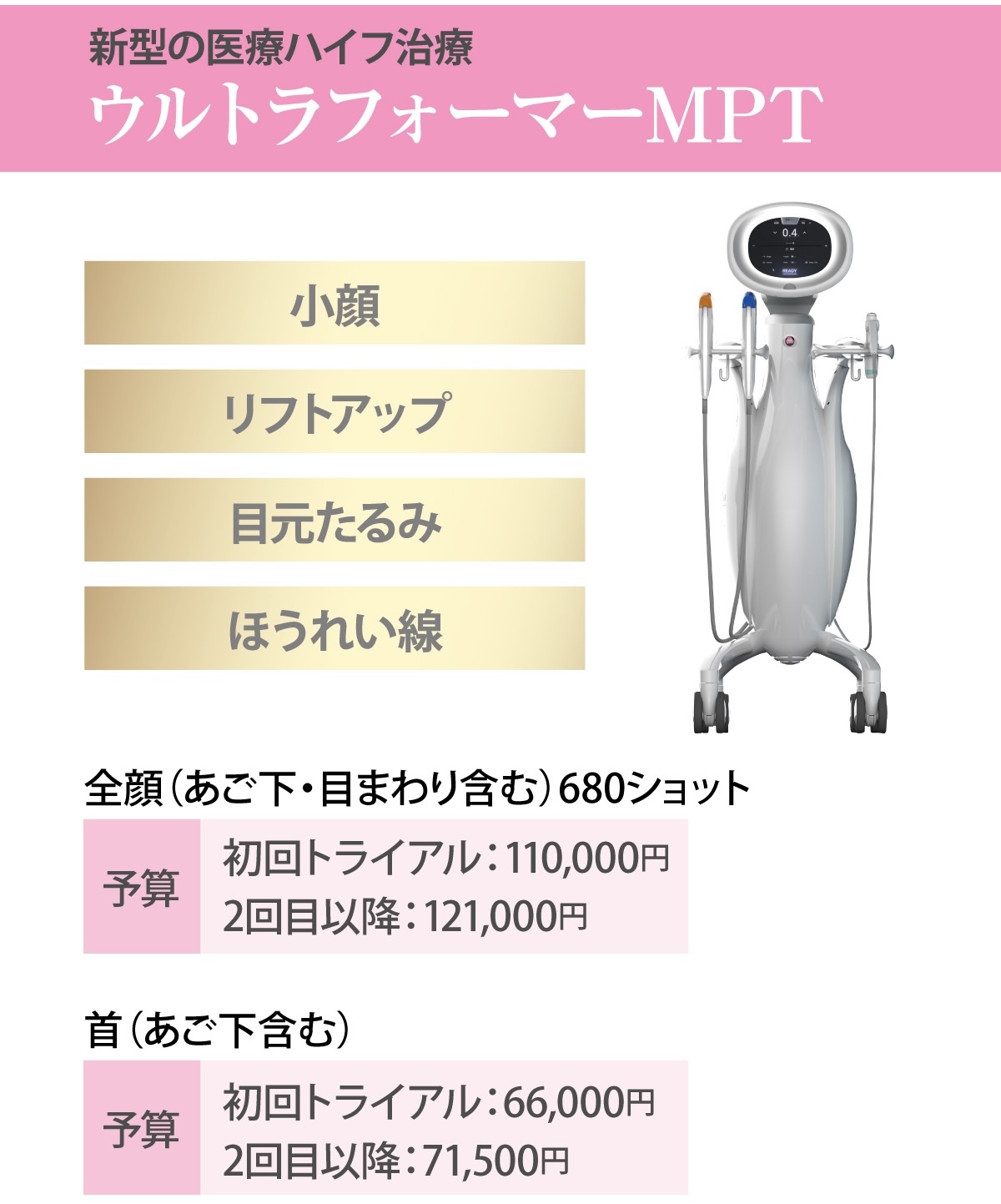 フルハイフ(初回トライアル:110,000円/2回目以降:121,000円)、Qスイッチルビーレーザー(1ショット/1,100円)、ゼオスキンヘルス・セラピューティック(1ヶ月26,000~40,000円)