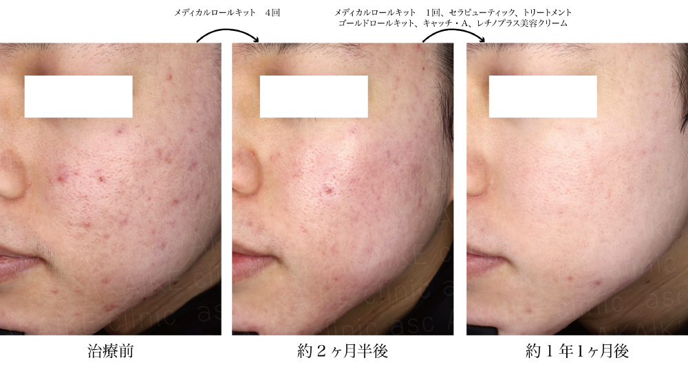 ニードリング・レーザー治療後で5カ月でニキビ跡が改善。ビタミンA治療を継続してさらにキレイな肌になった症例。
