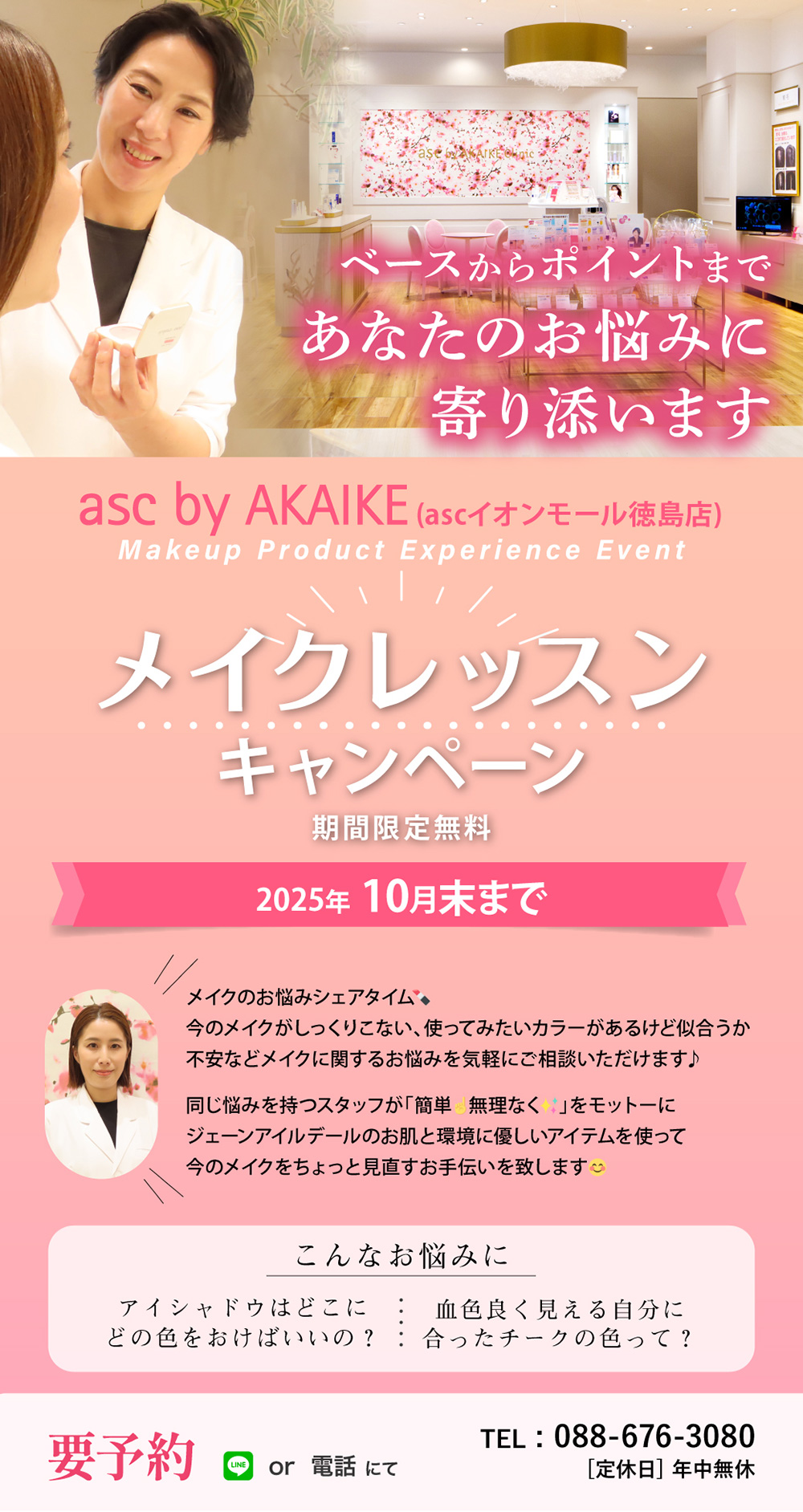 お求めはasc by AKAIKE店へ asc by AKAIKEドクターズ・コスメショップ〒770-0865 徳島県徳島市南末広町4番1号イオンモール徳島店3FTEL:088-676-3080営業時間 10:00~21:00/年中無休 LINE予約はこちら asc by AKAIKE店舗紹介はこちら