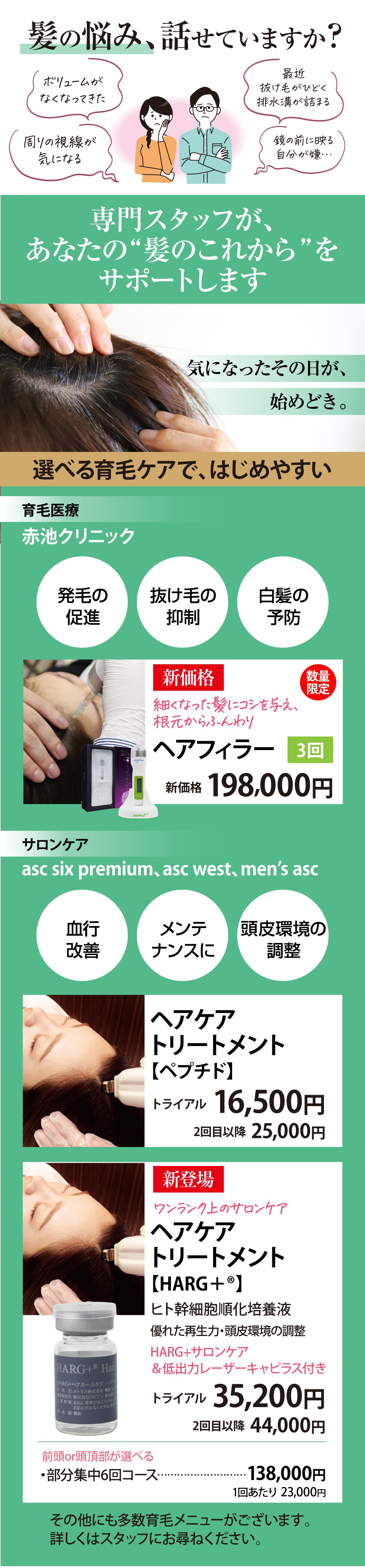 ヘアケアトリートメント(初回トライアル16,500円/2回目以降 25,000円)、リポゲイン(1ヶ月6600円)