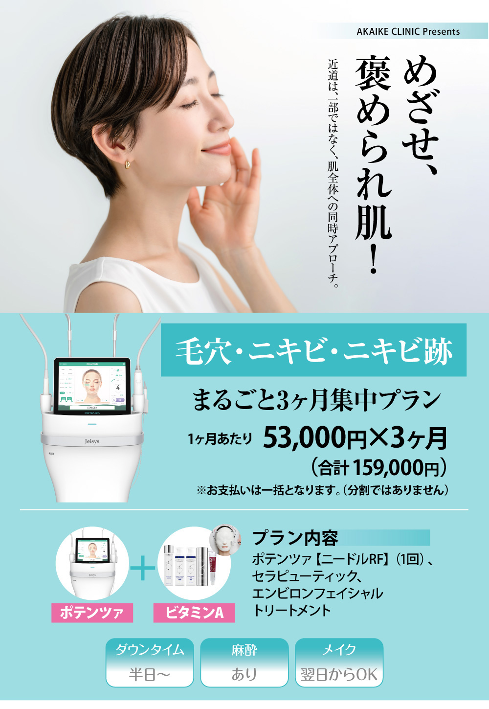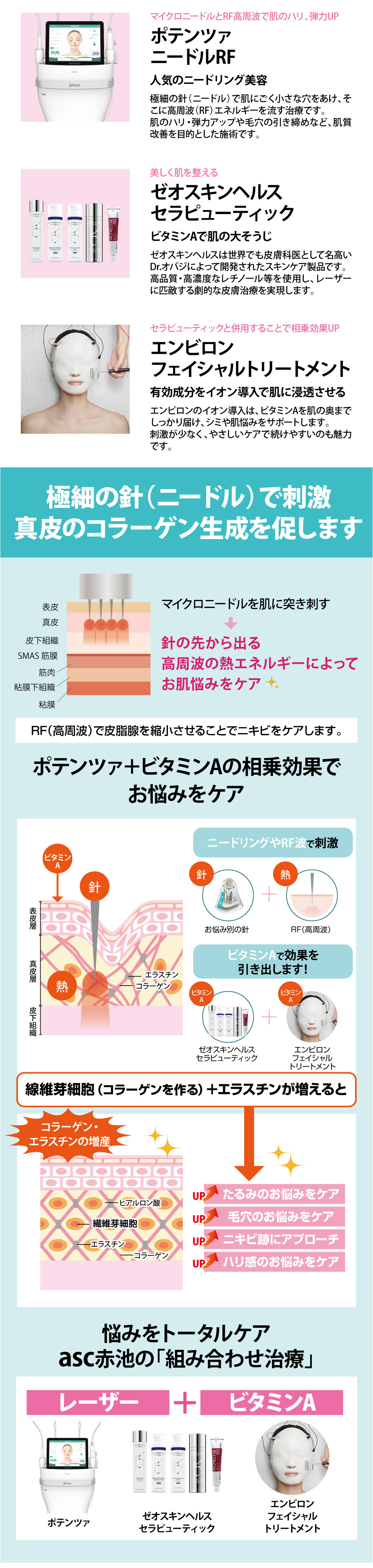 【治療内容と料金】ポテンツァ(ニードルRFニキビ)1回 (全顔 初回トライアル44,000円/2回目以降 49,500円)、ベピオゲル(990円)、ディフェリンゲル(1650円)、エンビロントリートメント(1回 8,800~13,200円)、ロールキット(針付きローラー47,960円※美容液は別途)
